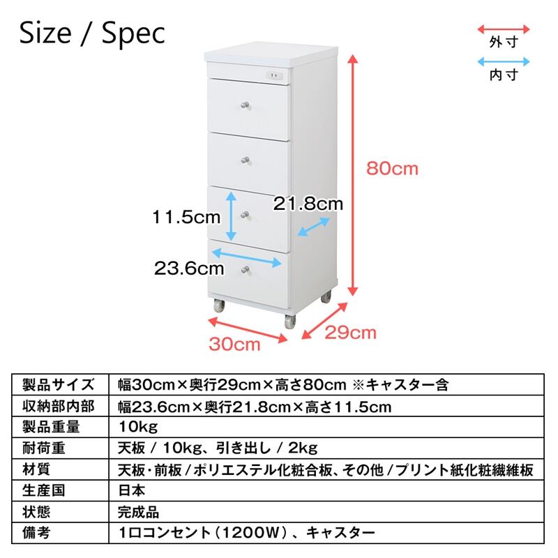 すき間ワゴン すきまワゴン 洗面所 ランドリー 収納 日本製 完成品 キャスター付き コンセント 洗面所 ランドリー スリム ホワイト 白 幅30cm 奥行29cm