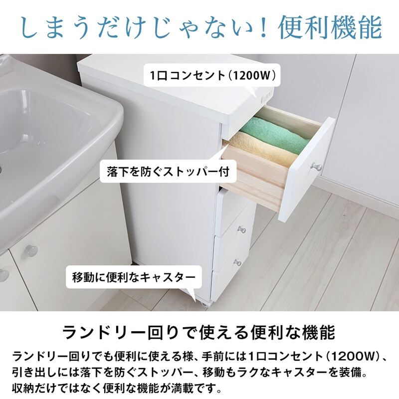 すき間ワゴン すきまワゴン 洗面所 ランドリー 収納 日本製 完成品 キャスター付き コンセント 洗面所 ランドリー スリム ホワイト 白 幅15cm 奥行44cm