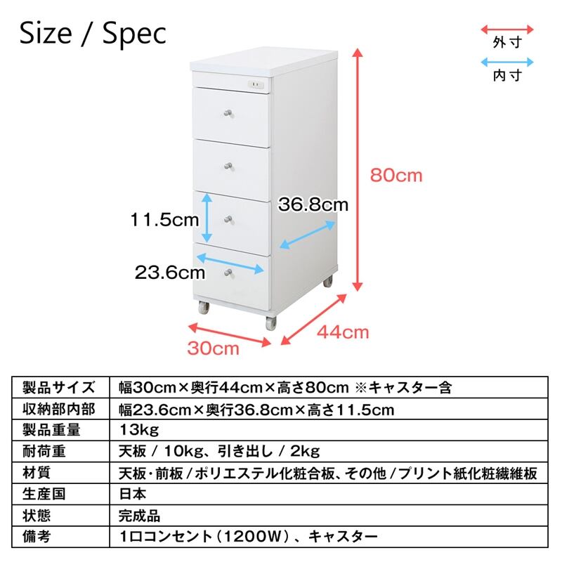 すき間ワゴン すきまワゴン 洗面所 ランドリー 収納 日本製 完成品 キャスター付き コンセント 洗面所 ランドリー スリム ホワイト 白 幅30cm 奥行44cm