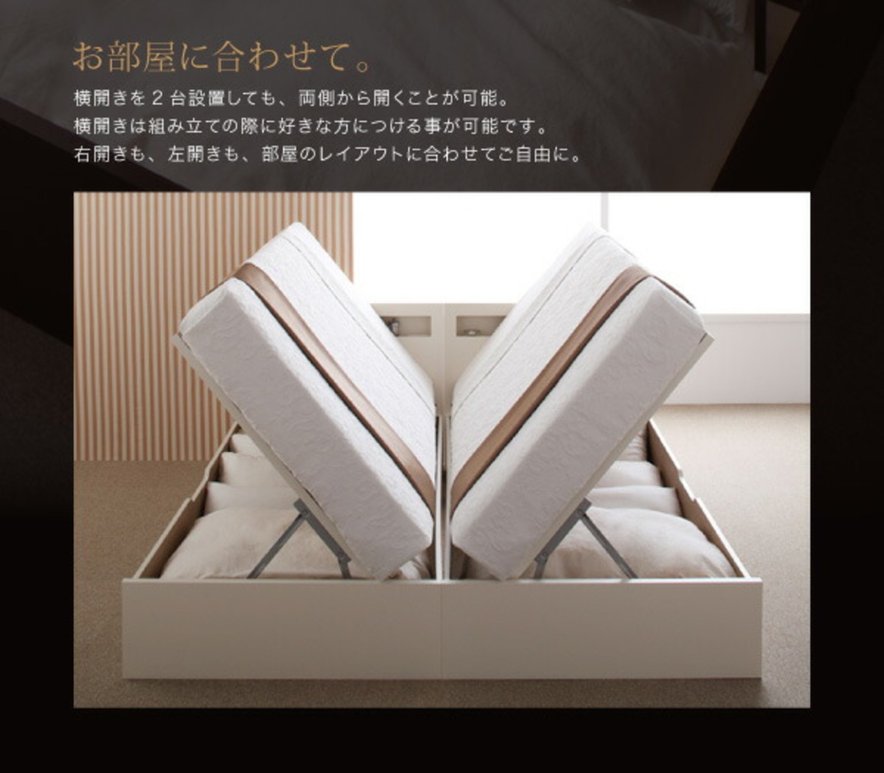 組立設置付 開閉タイプが選べる跳ね上げ収納ベッド 薄型抗菌国産ポケットコイルマットレス付き 縦開き シングル 深さラージ