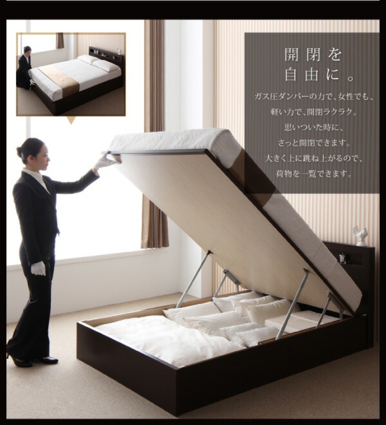 組立設置付 開閉タイプが選べる跳ね上げ収納ベッド 薄型プレミアムポケットコイルマットレス付き 横開き セミシングル 深さレギュラー