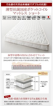 薄型抗菌国産ポケットコイルマットレス付き 横開き ヘッド付 シングル ショート丈 深さラージ 組立設置付