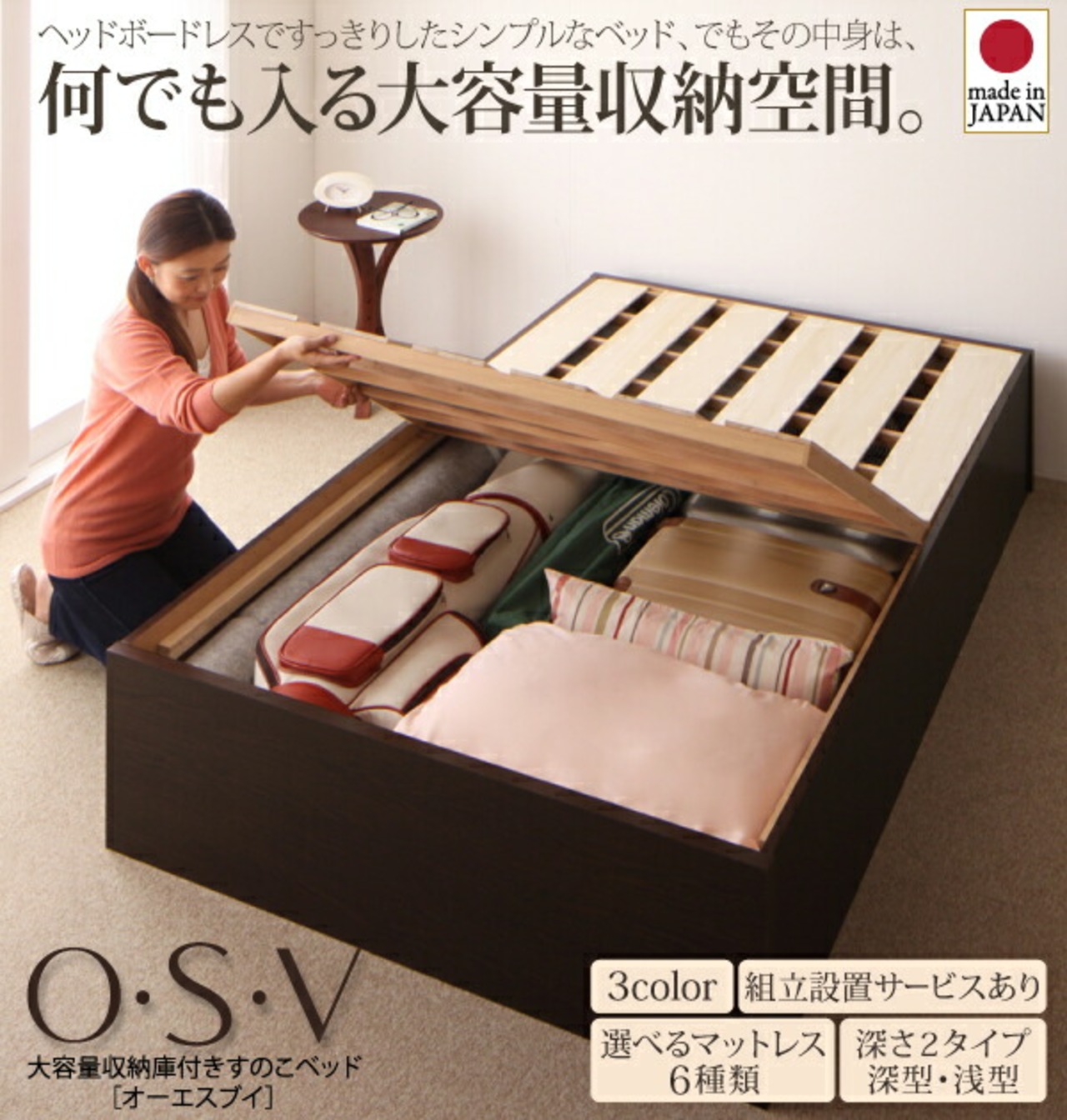 組立設置付 大容量収納庫付きすのこベッド HBレス 薄型プレミアムポケットコイルマットレス付き シングル 深さラージ