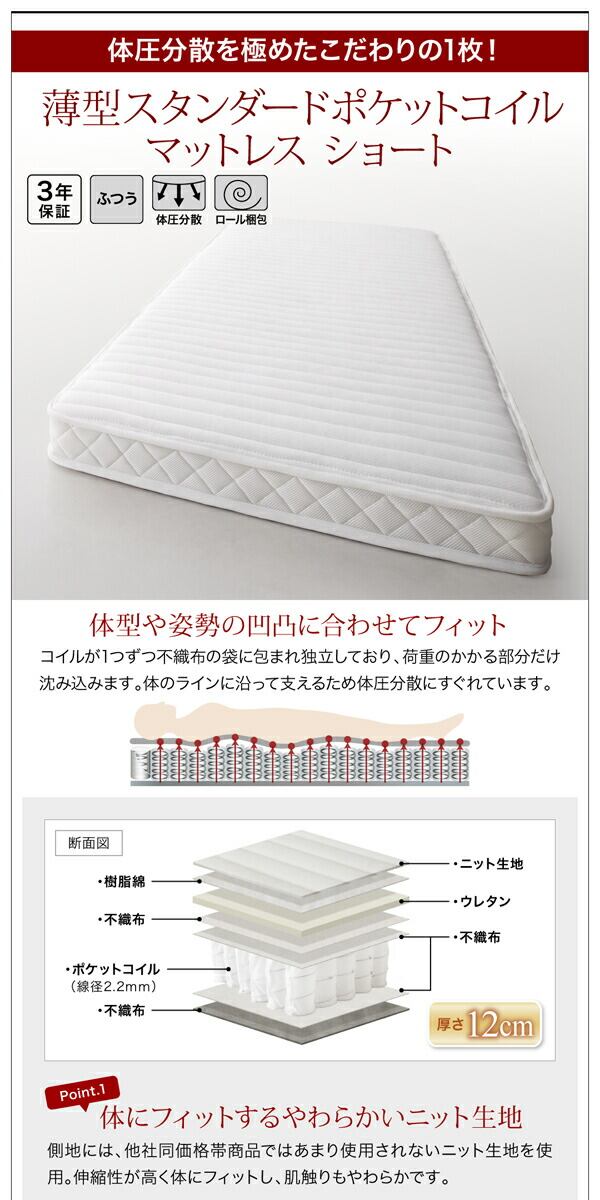 薄型抗菌国産ポケットコイルマットレス付き シングル ショート丈 組立設置付