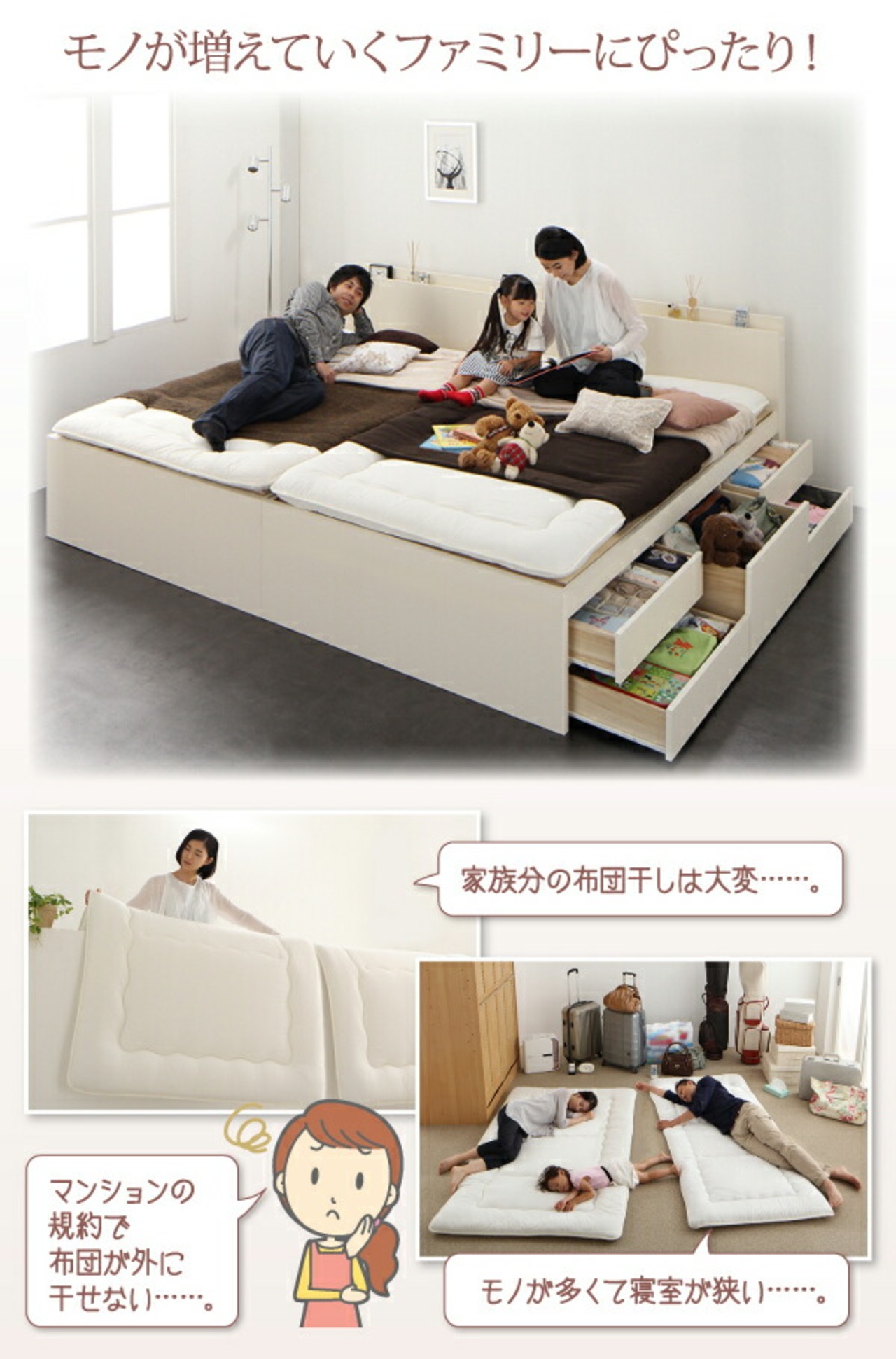 組立設置付 国産大容量収納ファミリーチェストベッド ベッドフレームのみ ワイドK220(S+SD)