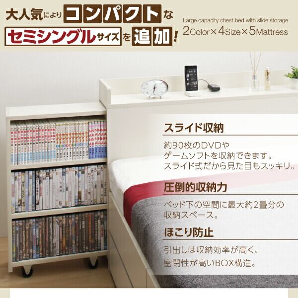 組立設置付き スライド収納付き_大容量チェストベッド 薄型プレミアムポケットコイルマットレス付き セミダブル レギュラー丈