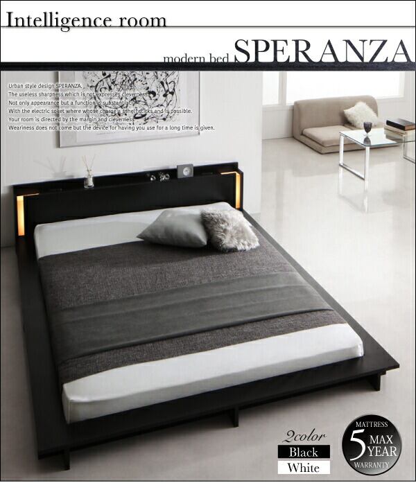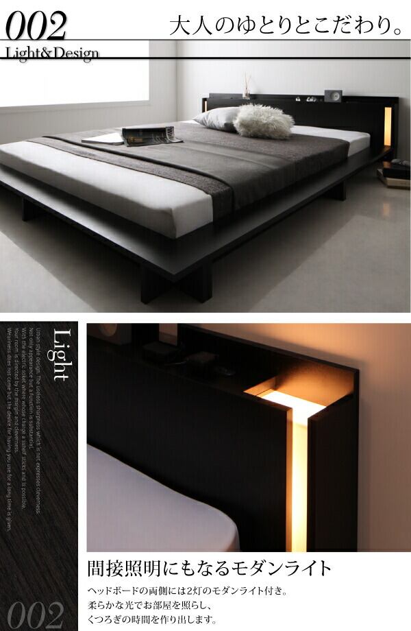モダンライト・棚・コンセント付きデザインフロアローベッド プレミアムボンネルコイルマットレス付き クイーン(Q×1) 組立設置付