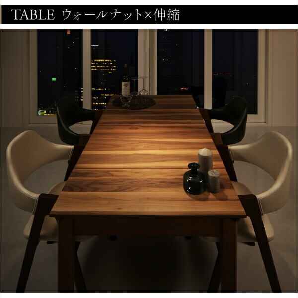 組立設置付き 天然木ウォールナット材モダンデザイン伸縮式ダイニングセット 6点セット(テーブル+チェア4脚+ベンチ1脚) W120-180