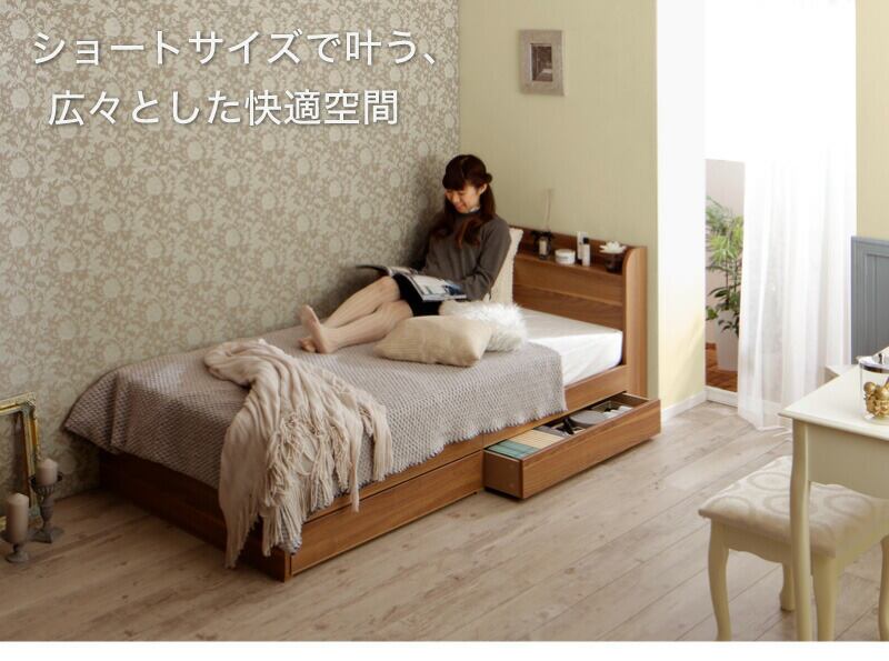 組立設置付き ショート丈収納ベッド 薄型プレミアムポケットコイルマットレスマットレス付き セミシングル ショート丈